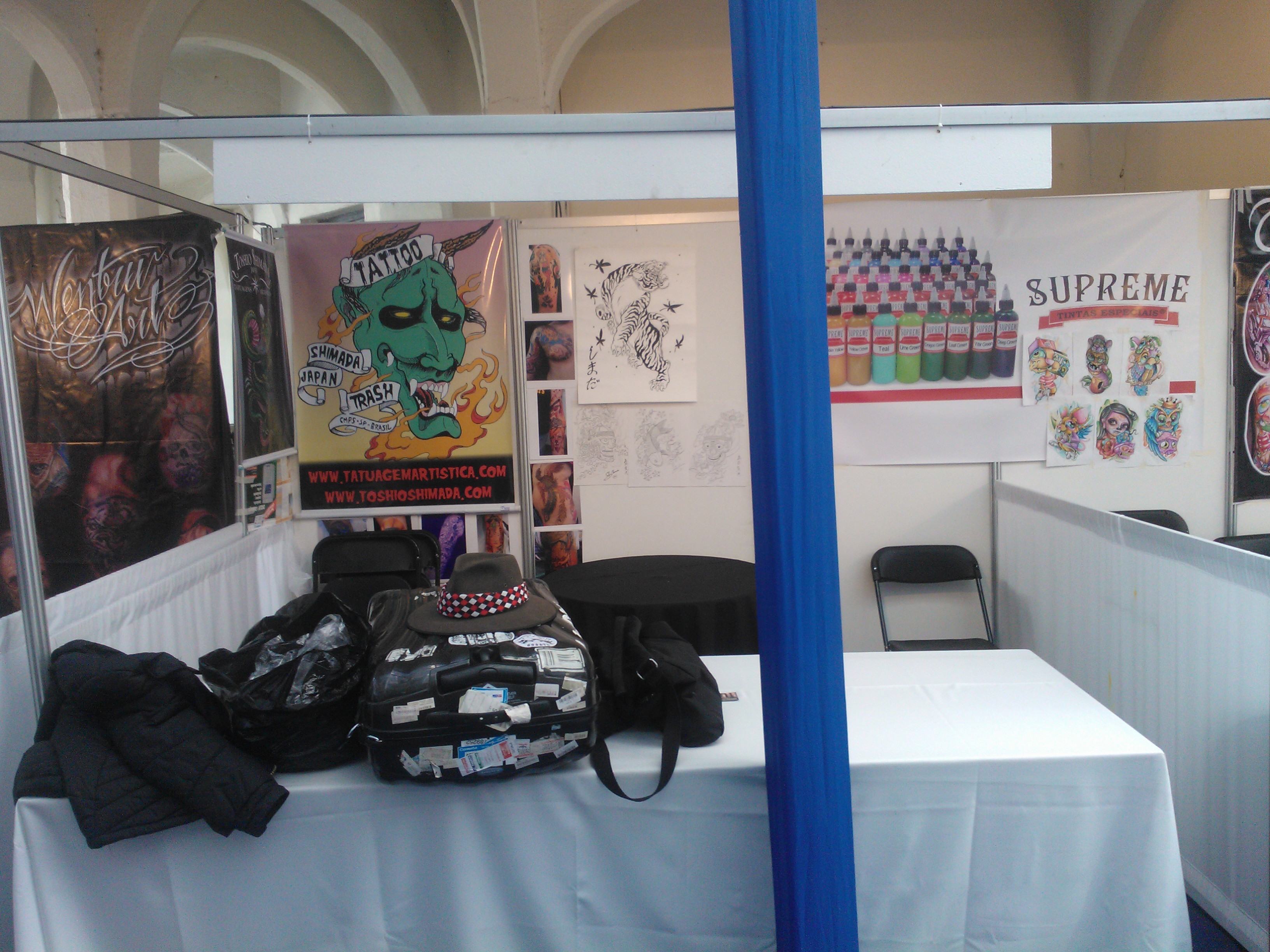 Após cruzar a Cordilheira numa quinta de manhã fomos recebidos no aeroporto pelo dono de uma conhecida marca de tintas local, que nos convidou a convenção e patrocinou o workshop de tatuagem oriental do Shimada. Nossos dois primeiros dias em Santiago foram dedicados a conhecer a comida local, os estúdios de tatuagem patrocinados por nosso anfitrião, além dos ajustes finais para o primeiro dia da convenção. Após pegarmos o material de divulgação que faltava, rumamos para o clube hípico de Santiago. Patrocinando diversos artistas da América Latina, estávamos alojados em um stand que contava com 15 tatuadores do Chile, Bolívia, Peru, Brasil,Japão entre outros, dividindo o espaço com os amigos do Iron Tattoo, de Santiago mesmo.