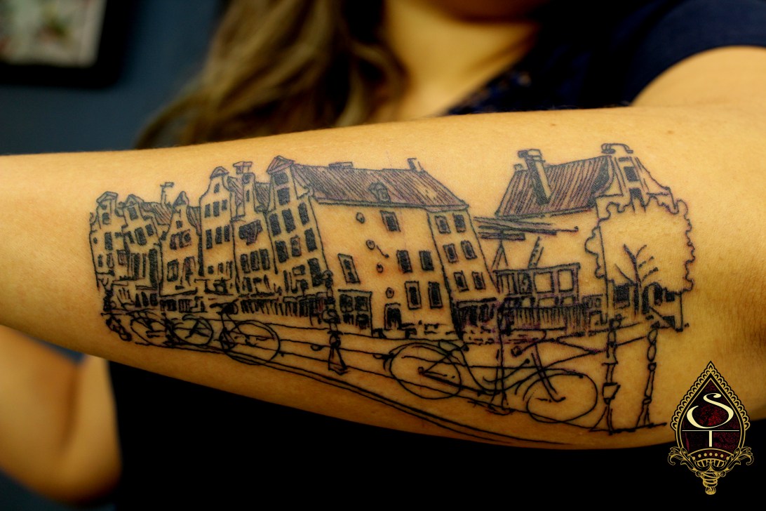 Linhas e arquitetura, desenho de Amsterdam feito pela cliente.