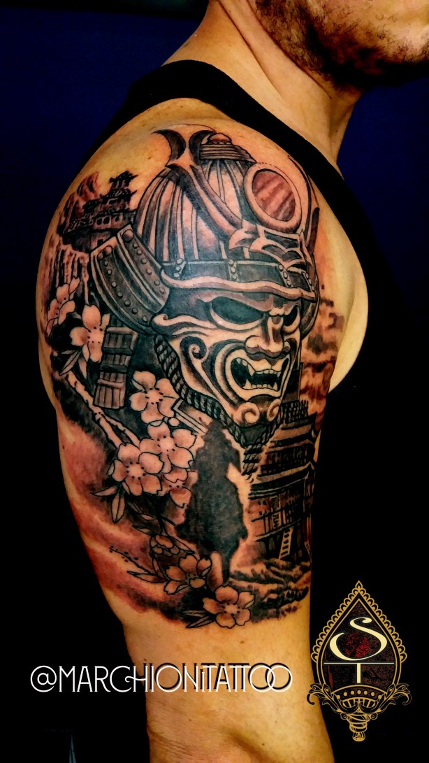 Mascará de Hannya, pagoda e sakuras sombreados.