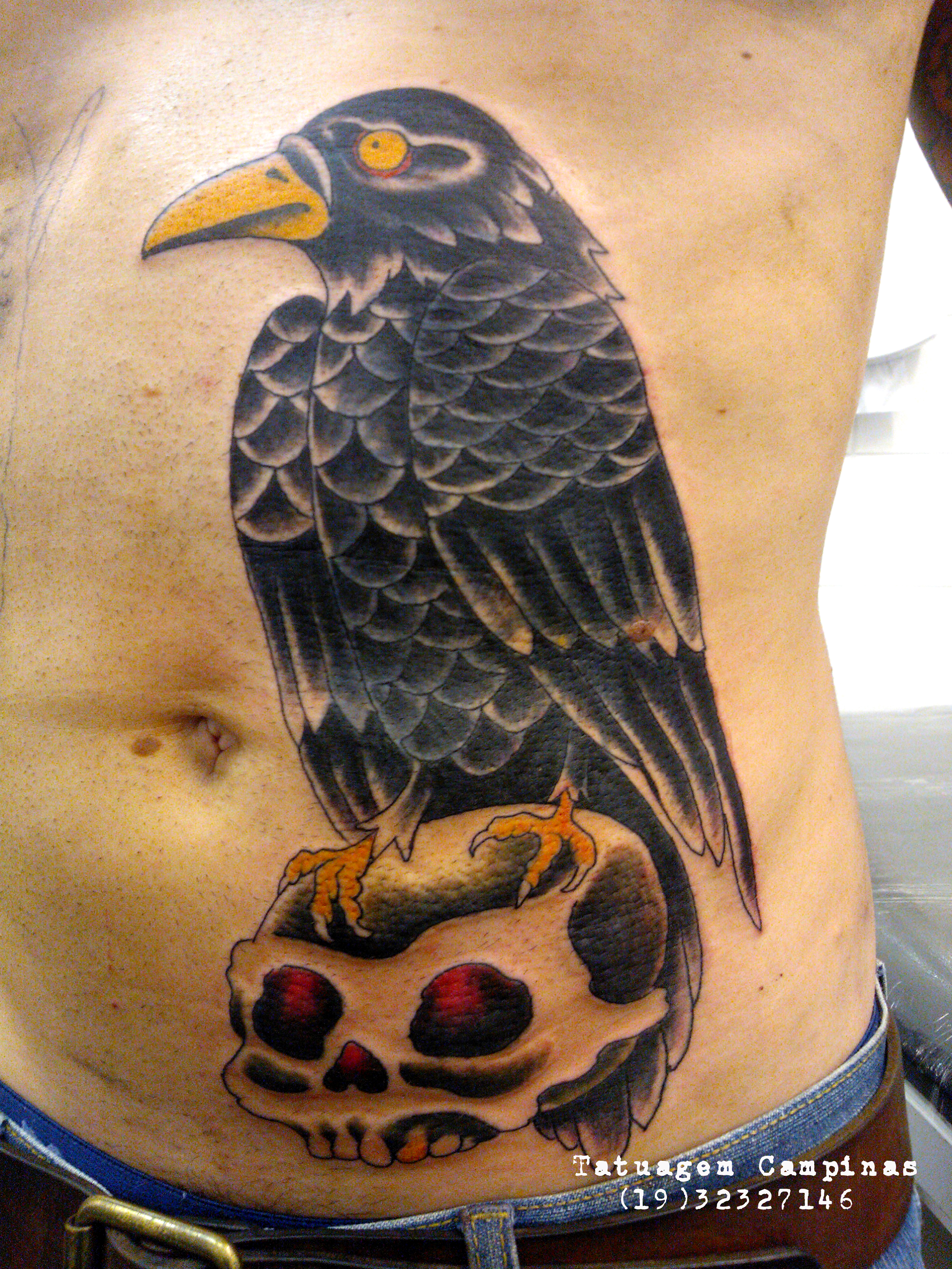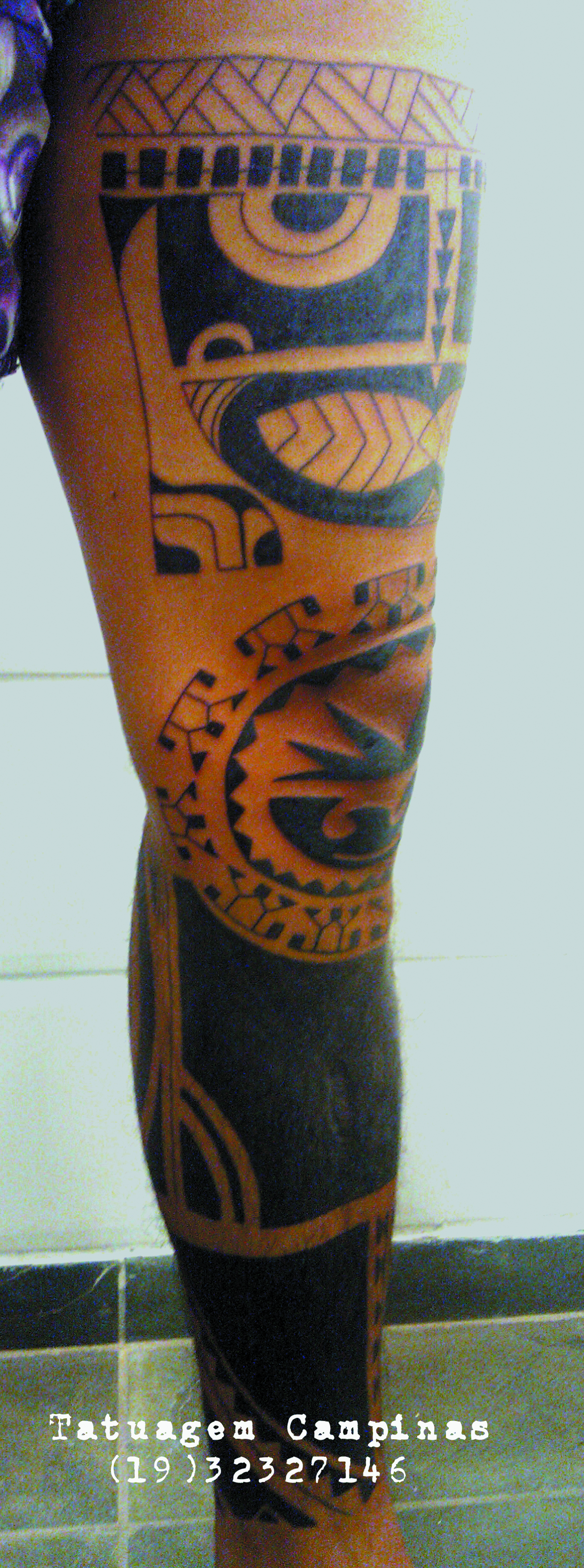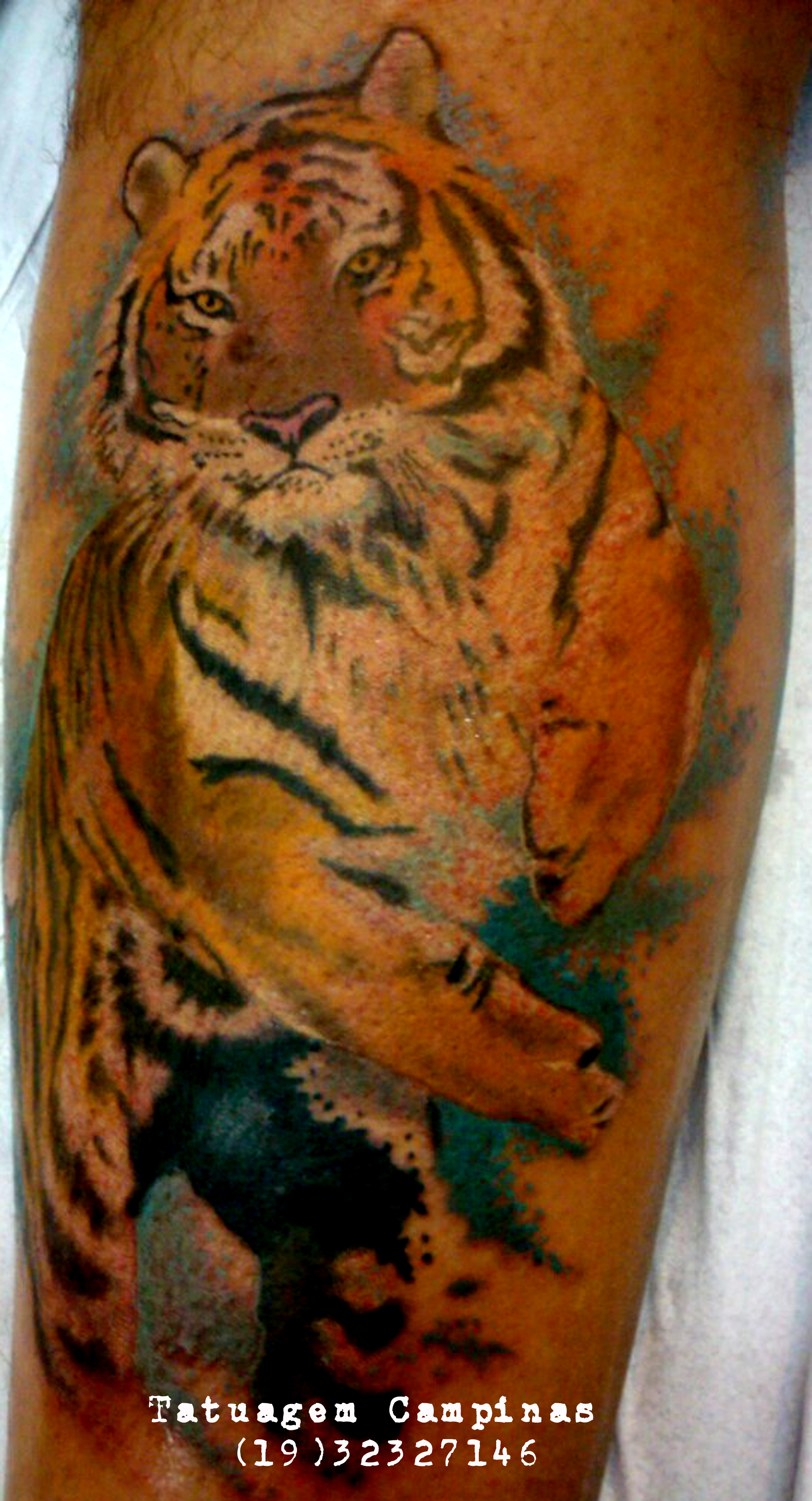 Tatuagem foto-realista na perna e fósseis nos pés.