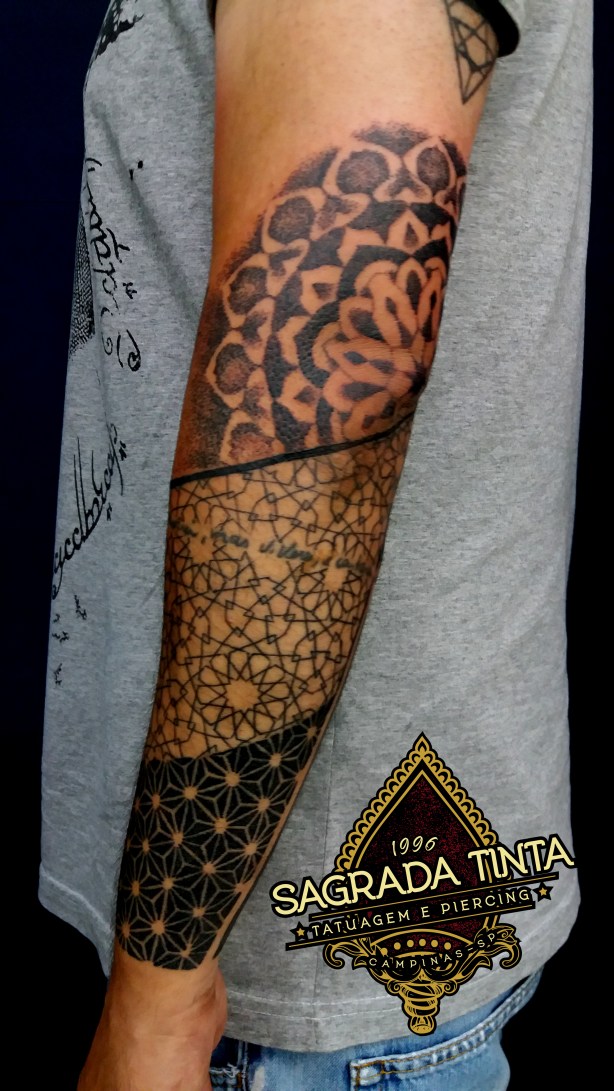 “Blackwork” geométrico, linhas e mandala pontilhista.